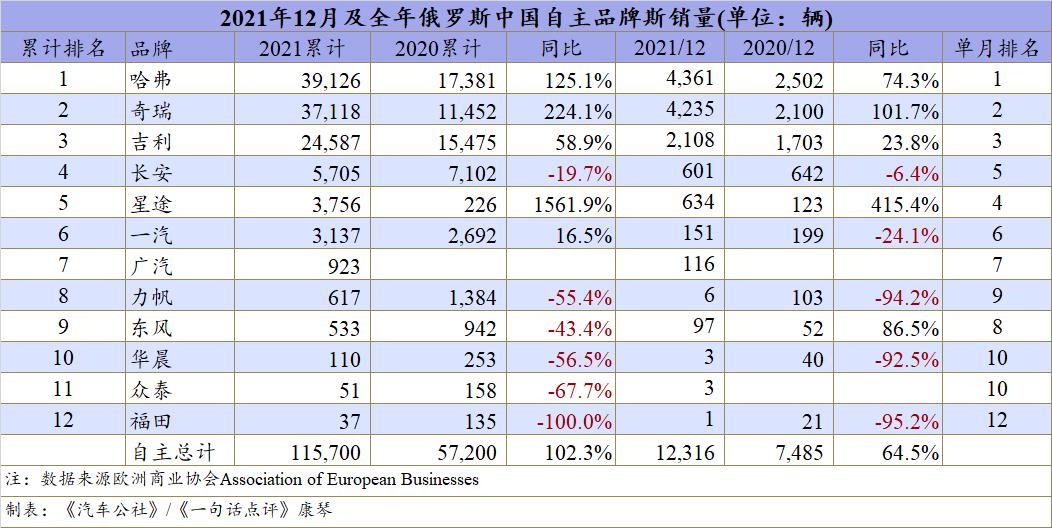 2021年,哈弗、奇瑞和吉利在俄罗斯市场销量分别上涨125%、224%和59%,而中国车企的总销售量占到了当年全俄汽车销售量的7%。尤其是在俄乌冲突之后,大部分欧洲品牌以及日本品牌车型的销量直线下降,反倒是中国品牌车型销量迅速攀升。