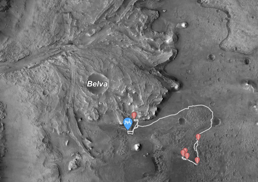 毅力号在火星上的轨迹及当年位置。它一直都在耶泽罗坑底行驶,目前正朝着左上角的三角洲主体进发。至于为什么不直接降落在三角洲上…… 看看这个地势就明白了 | NASA/JPL-Caltech/University of Arizona