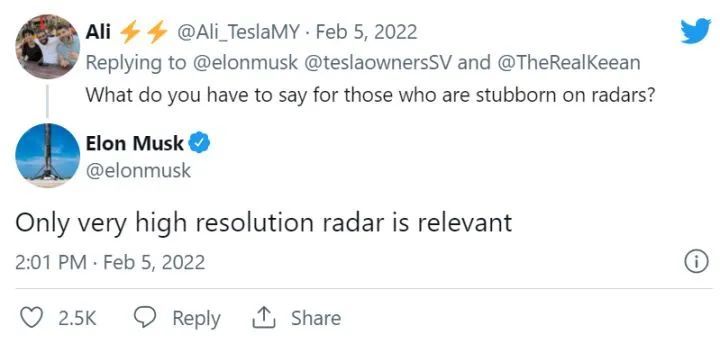 其实,马斯克对毫米波雷达的态度也从未一棍子打死,今年初他在推特上互动时,留下了颇有暗示意味的回复:“高精度(毫米波 )雷达才是正解。”