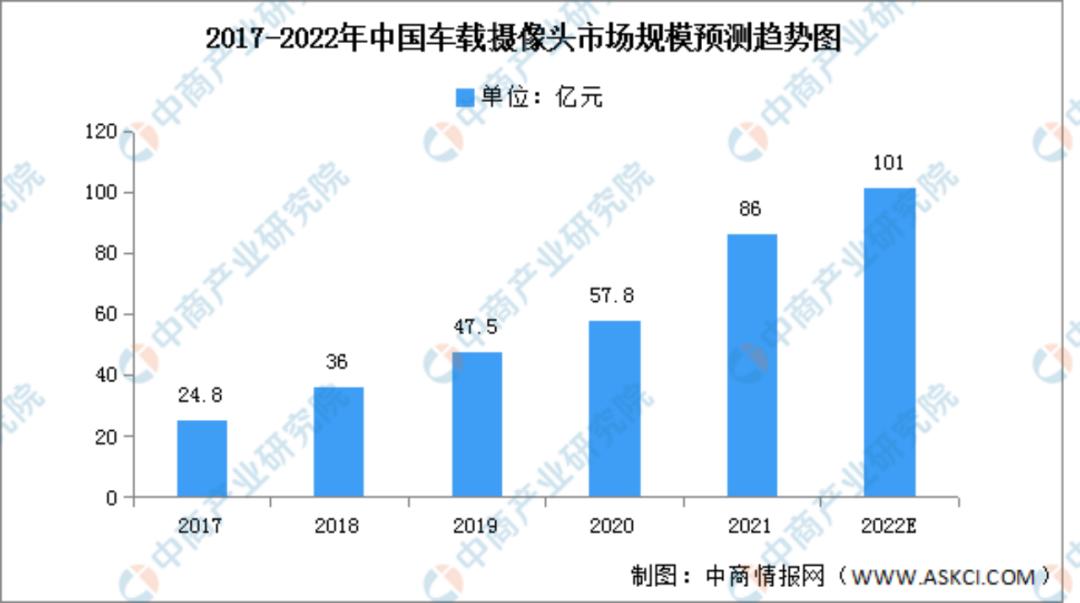 根据沙利文数据,2017年至2020年,中国车载摄像头的市场规模从24.8亿元增加到57.8亿元,年均复合增长率为32.58%。预计未来会保持增长,2022年将达101亿元市场规模。