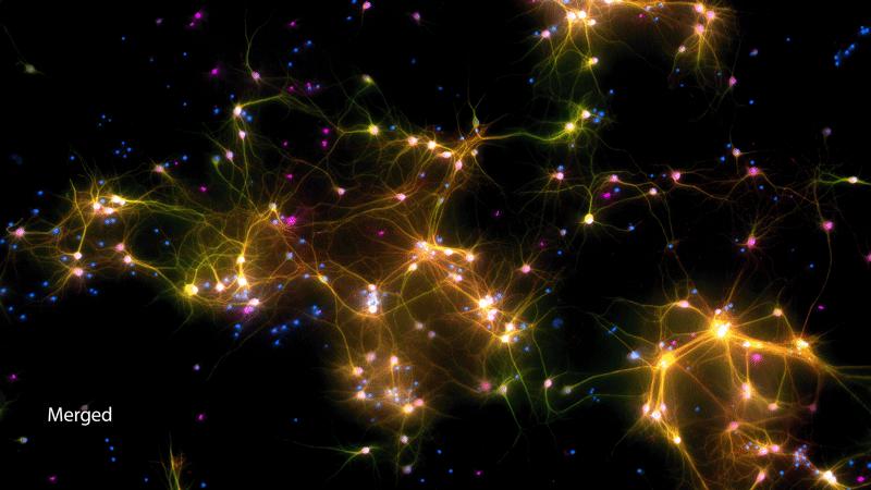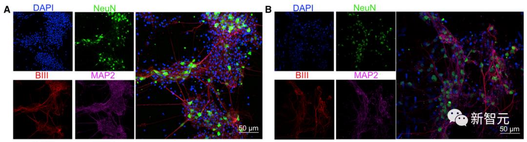 其中,蓝色DAPI代表染色所有细胞,绿色NeuN显示是神经元,微管蛋白 (BIII) 标记是轴突,MAP标记的是树突。