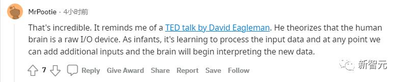 「令人难以置信,它让我想起了David Eagleman的TED演讲。他认为人脑是一个原始的I/O设备。作为婴儿,它正在学习处理输入数据,并且在任何时候我们都可以添加额外的输入,大脑将开始解释新数据。」