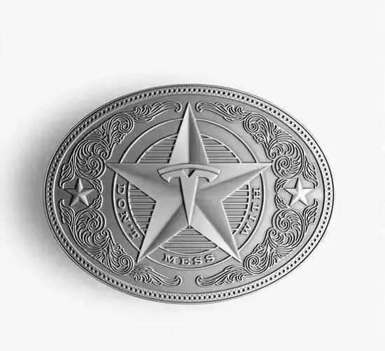穿搭单品可不止这条红短裤,还有一条 150 美元的皮带扣,风格很「德克萨斯州奥斯汀超级工厂」,由压铸锌雕刻制成,上面印着一行字: