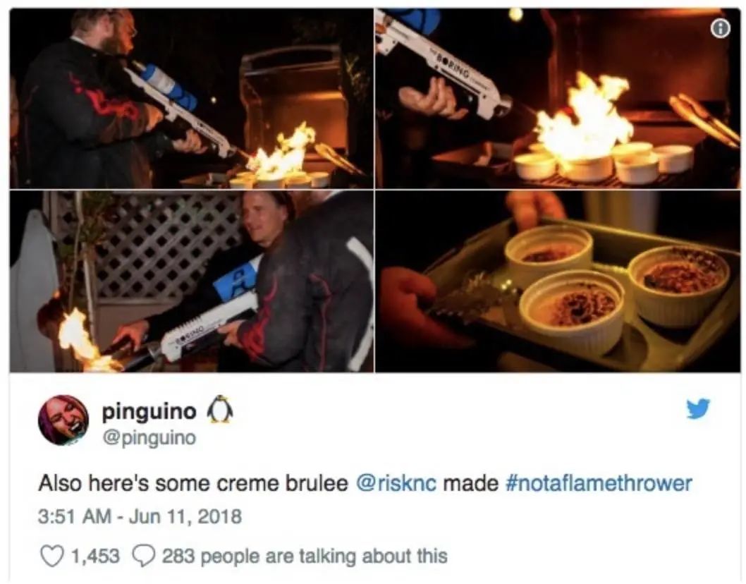 2018 年,广大网友如愿让马斯克推出了被全网热议的「火焰喷射器」:Not-A-Flamethrower。
