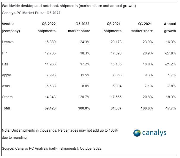 另一家咨询机构IDC也公布了最新的PC市场数据。由于统计口径不同,该公司的数据显示,今年三季度全球PC发货量总计为7420万台,同比下滑15%,原因是需求降温和供应不平衡。
