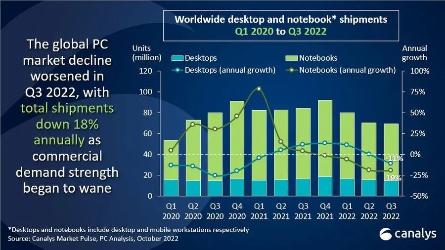 10月11日,市场调研机构Canalys发布的报告显示,全球PC市场在2022年第三季度出现需求大幅下滑,期内台式机和笔记本电脑的总出货量为6940万台,同比下滑18%。