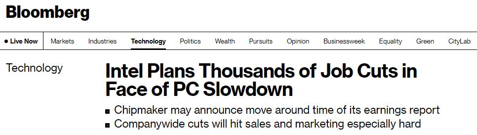 从供应链的动作来看,持续下行的PC市场确实让他们感受到越来越大的压力。10月12日,彭博社援引知情人士爆料称,英特尔正计划大规模裁员,人数可能达数千,部分业务裁员比例可能达到20%,以削减成本并应对不断恶化的PC市场。