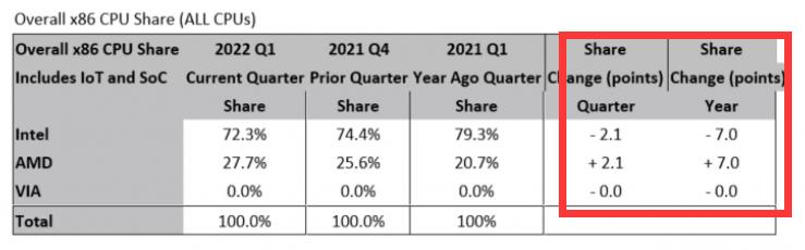 2022年一季度,X86 CPU总体市场份额 图源:Mercury Research
