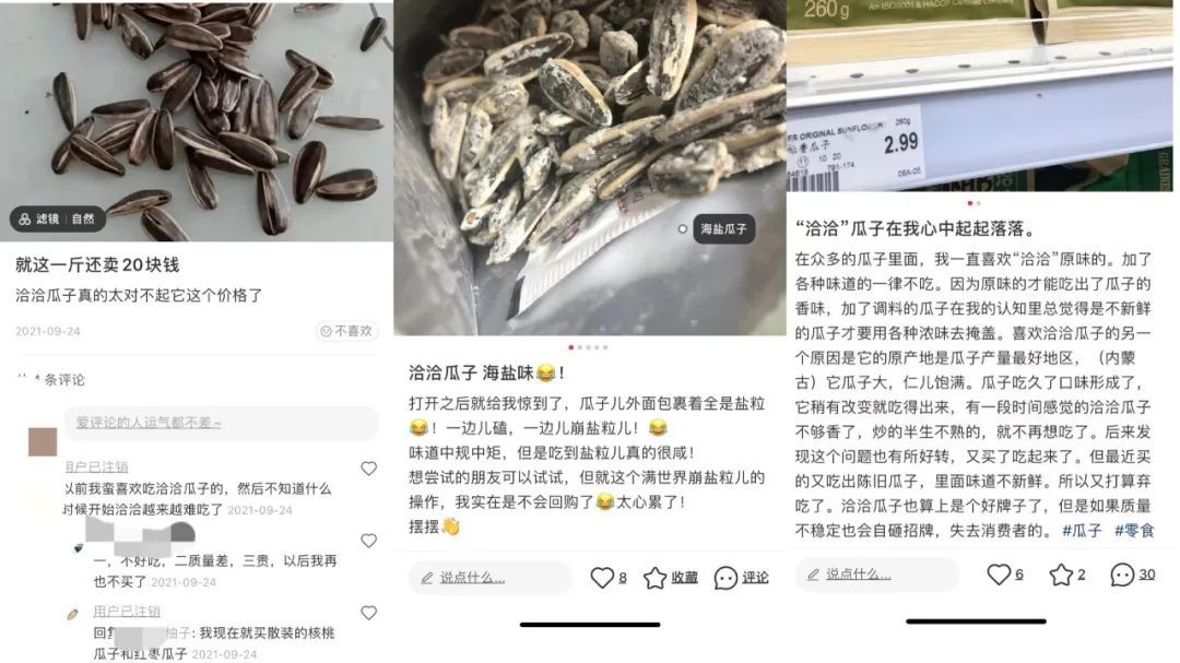 “洽洽瓜子在我心中起起落落。”在小红书上,有网友发布笔记称,“在众多的瓜子里面,我一直喜欢洽洽原味的……有段时间感觉洽洽瓜子不够香了,炒得半生不熟的,就不想吃了。后来发现这个问题有所好转,又买了吃起来了。但最近买的又吃出陈旧瓜子,里面味道不新鲜,所以又打算弃吃了。”