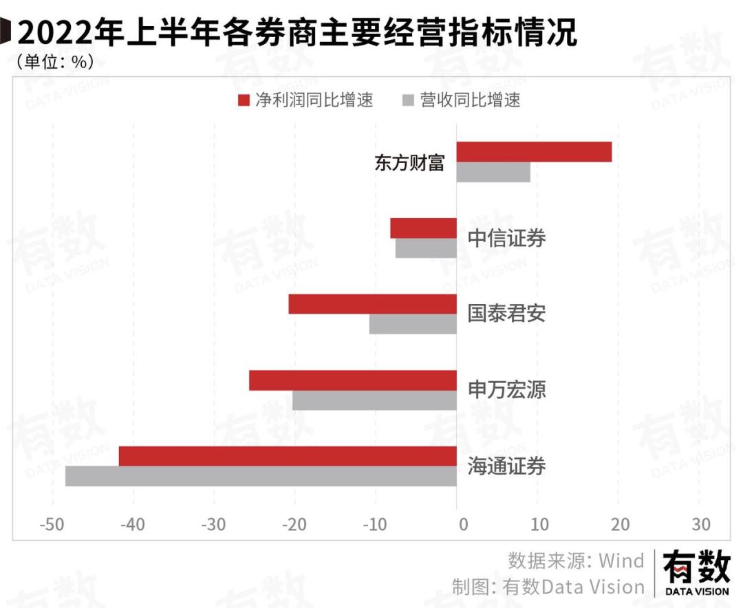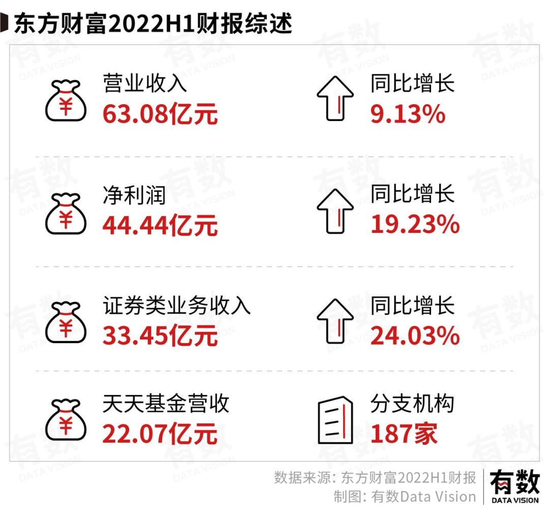 但东方财富在这行情中却是硕果仅存的实现营收增长的券商,今年上半年营收63.08亿,同比增长9.13%,净利润44.44亿,同比增长19.23%。