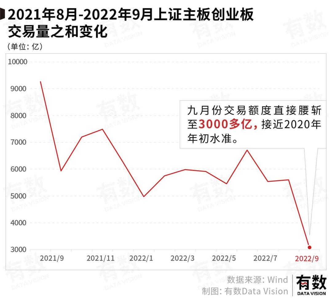 根据上交所深交所发布的数据来看,股市交易额一直跌跌不休,自2021年8月份创出天量交易额之后,2022年每个月交易额明显产生下滑,而且九月份交易额度直接腰斩至3000多亿,接近2020年年初水准。