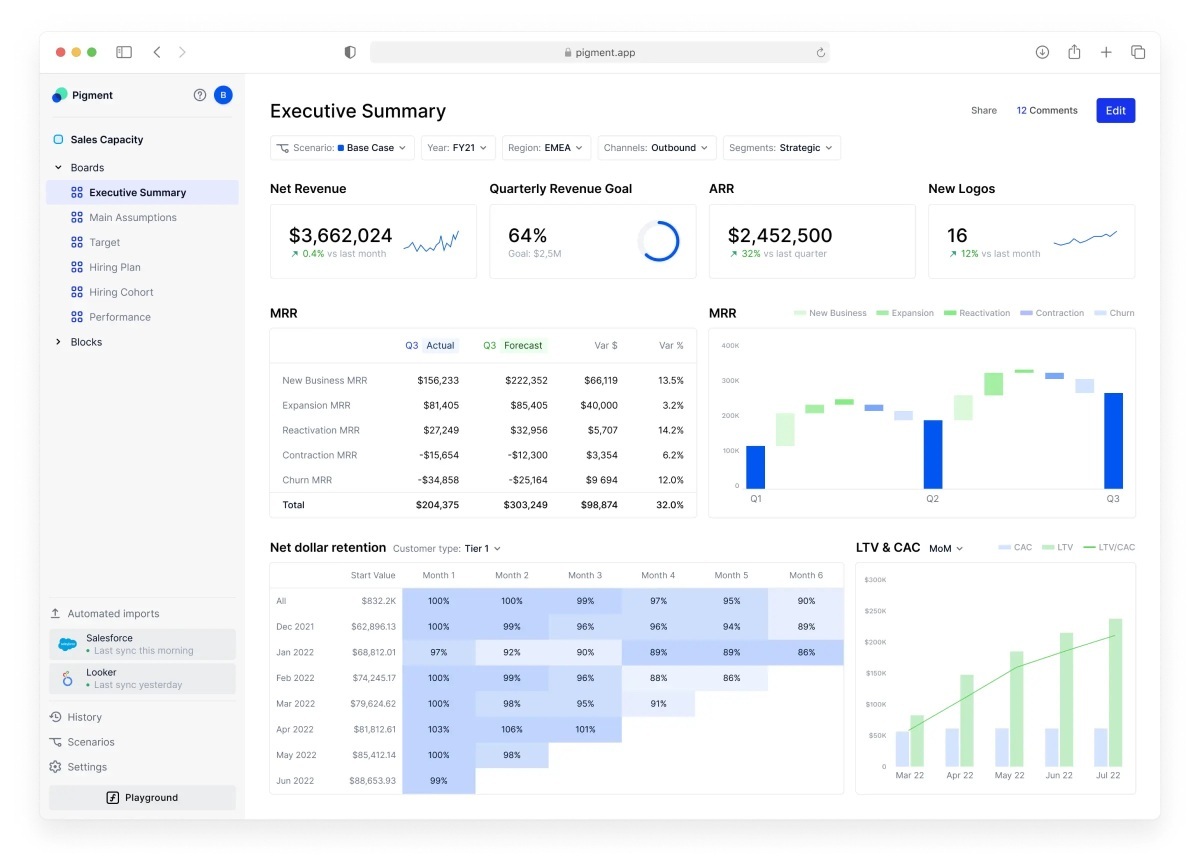 由于当前全球经济环境每况愈下,因此市场中大多数企业不得不为最坏的情况做打算,这让商业规划产品在企业战略中的地位就显的格外重要。「Pigment」为企业发展提供商业计划和预测平台,为客户企业未来的发展提供所有重要的商业指标并帮助其做出重大决策。「Pigment」与客户公司通过数据库工具相连接,如Salesforce、NetSuite、Workday和Snowflake。客户通过「Pigment」从其他产品中导入、清理并丰富公司数据。只要客户在平台中输入了数据,「Pigment」便可以自动提供商业分析报告,以全面的反映客户公司的商业指标。