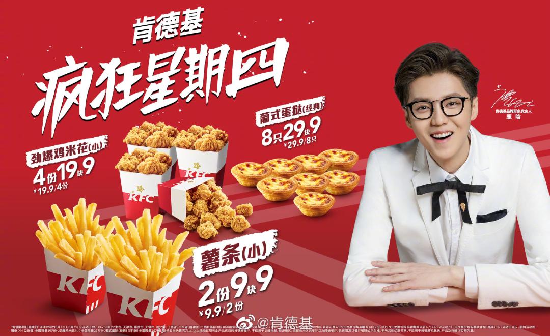 而后经过肯德基内部决定,疯狂星期四这样一个品牌专属限定日正式诞生,并在2018年与国内消费者们见面。疯四早期,肯德基还是以传统代言人的方式,对促销日进行宣传。例如找到鹿晗等流量明星进行广告推广,但实际上传播效果并没有拉高国民度。