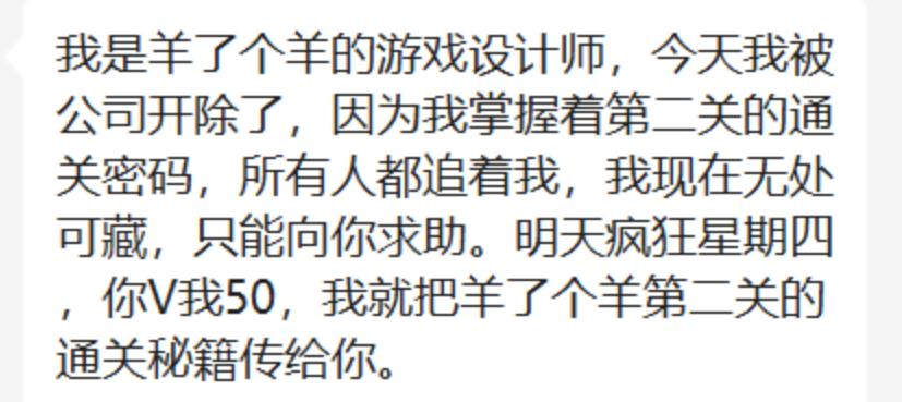 其实不管是任何一种形式,文段、图片也好,疯狂星期四最终都会化作一句“肯德基疯狂星期四,V我50,谁请我吃?”。俨然一副丐帮帮主的样子,召集了全体在周四“嗷嗷待哺”的网友。