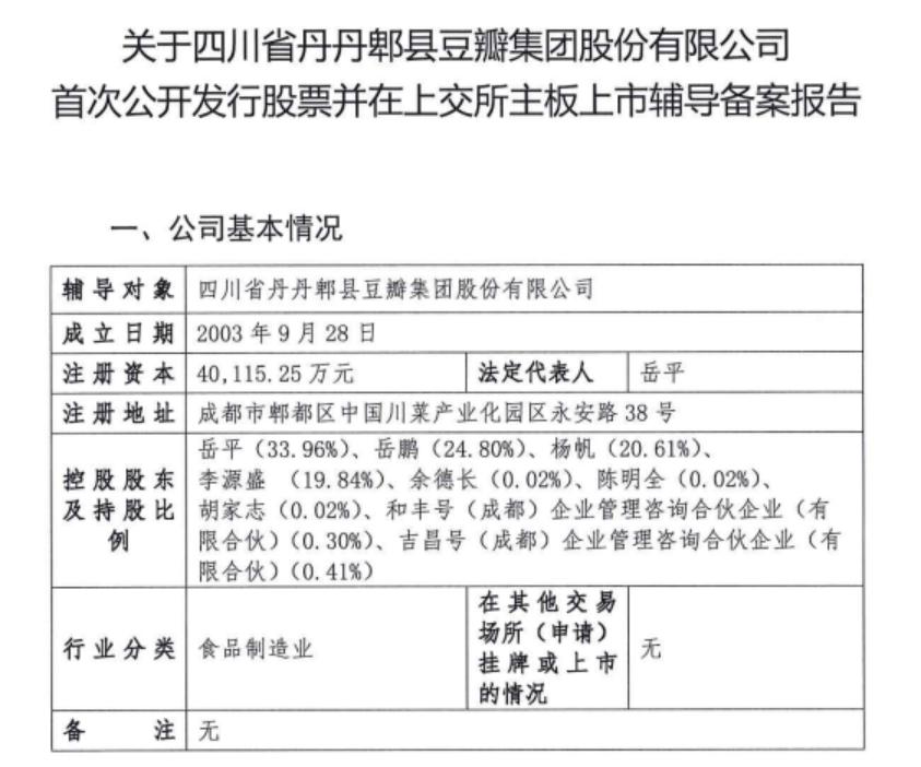 此前,四川省丹丹郫县豆瓣集团股份有限公司(以下简称“丹丹豆瓣”)披露了首次公开发行股票并在上交所主板上市辅导备案报告,辅导机构为招商证券。