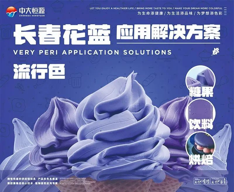 来自我国中大恒源生物的研发团队,更是PANTONE色彩研究所揭晓的22年度流行色PANTONE 17-3938长春花蓝中汲取灵感,创新尝试将定义的流行色融入食品的应用。