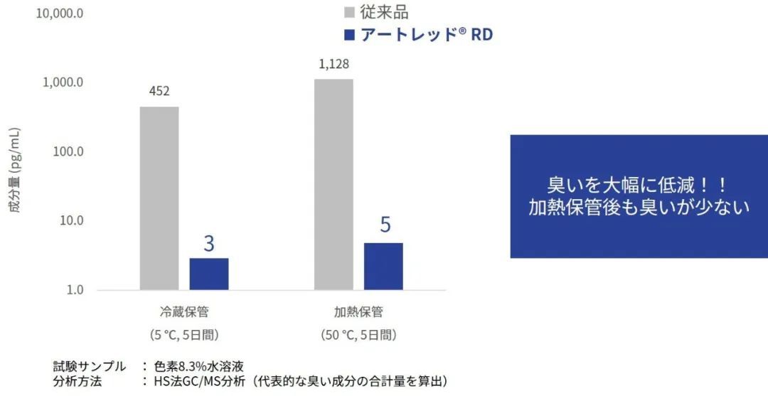ARTRED® RD使用San-Ei Gen的专利技术,使得产品与传统的红萝卜色素相比,“甲硫醇”、“二甲基二硫醚”、“二甲基三硫醚”的等异味成分的含量减少99%以上。