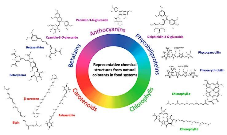所谓的天然色素是通过天然资源获得的食用色素,按来源不同可分为植物色素、动物色素、微生物色素三大类;若按色素按照化学结构可分为多烯色素、酚类色素、吡咯色素、醌酮色素、其他类色素;按溶解性则能分为水溶性色素和脂溶性色素。