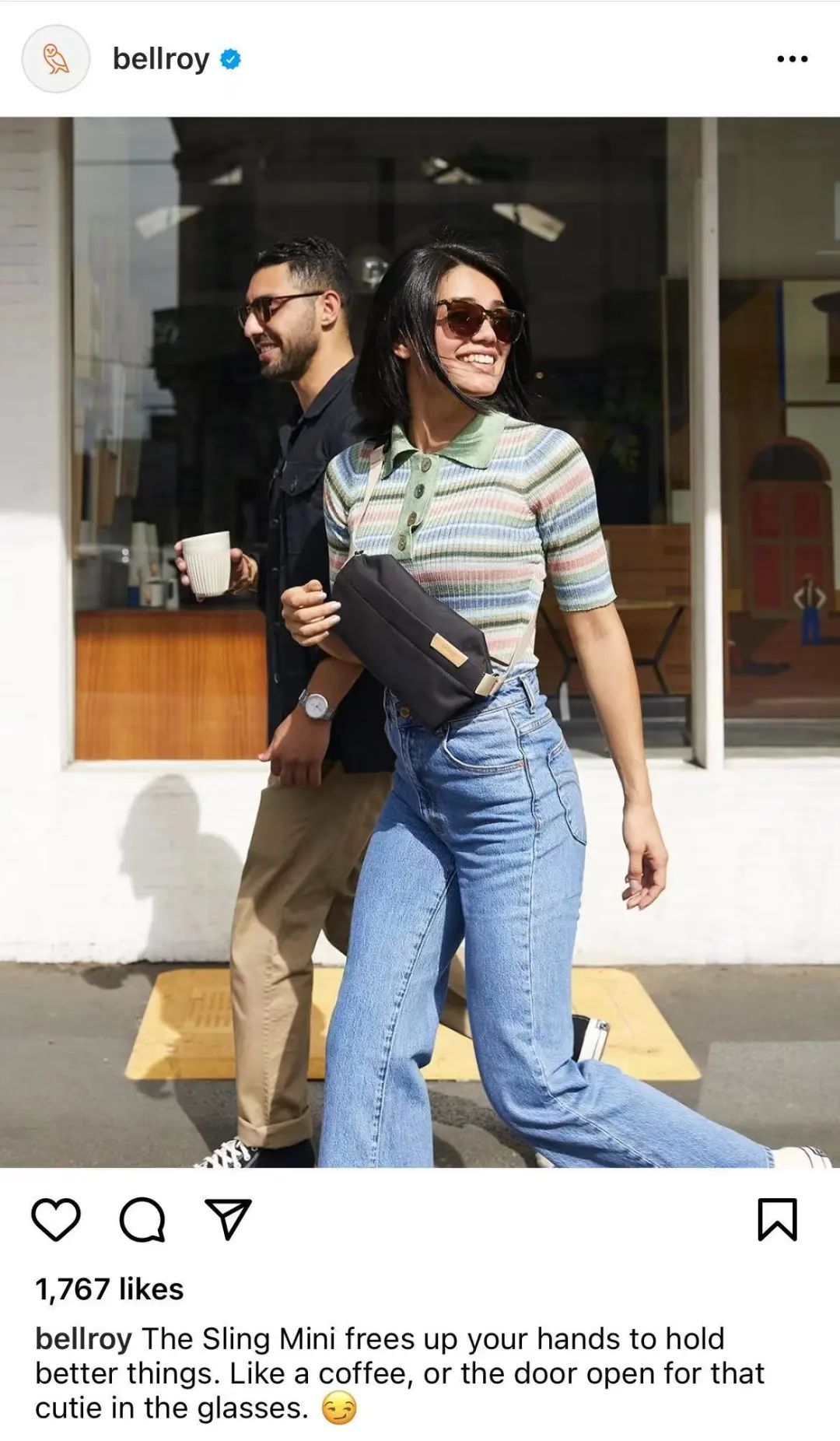 但也有国内员工很难突破的“本地化瓶颈”。澳洲品牌Bellroy曾有一条Instagram文案令Phoebe印象深刻。那条给迷你腰包的文案大意为:“空出双手,拿上喜欢的咖啡,或者给爱人开门。”不仅简练、幽默、有文采,还搭配了符合当地文化的街景图片——听上去简单,然而实际上大部分中国出海企业都以铺货、解释卖点为主,很少能做到深入当地消费者的心理文化。