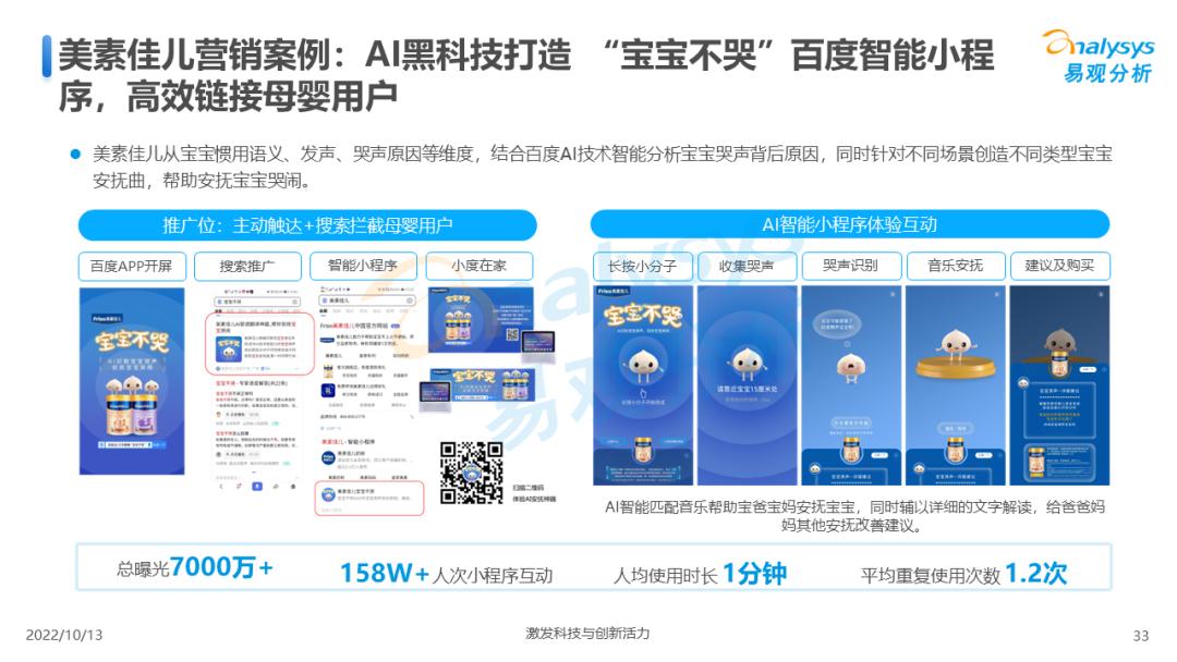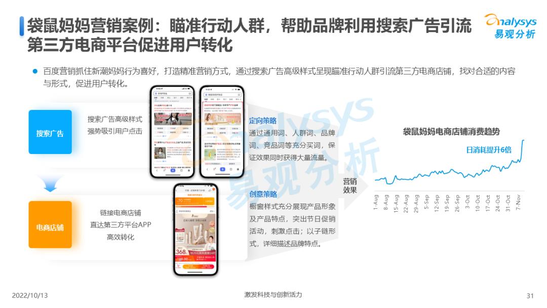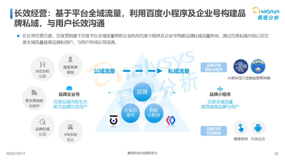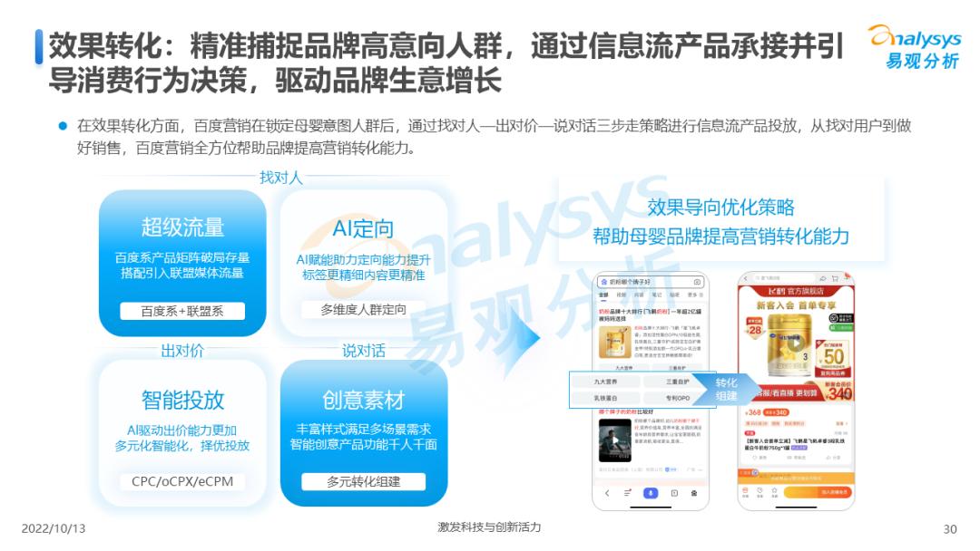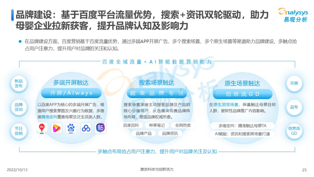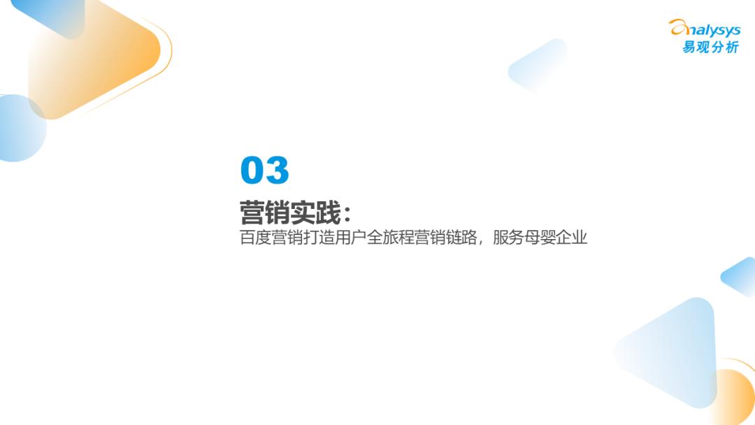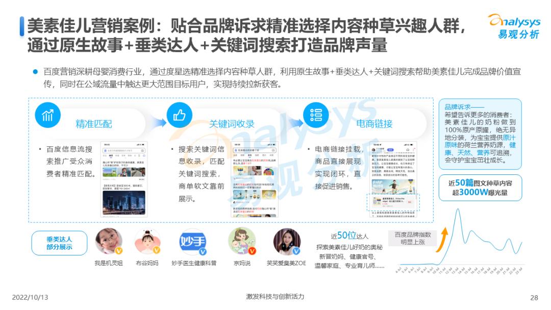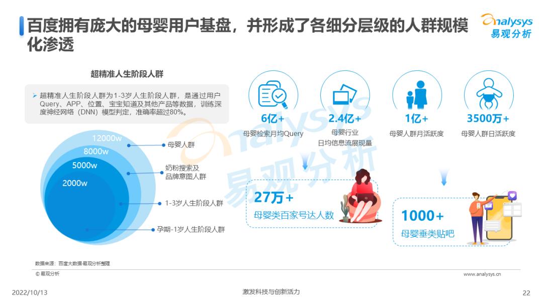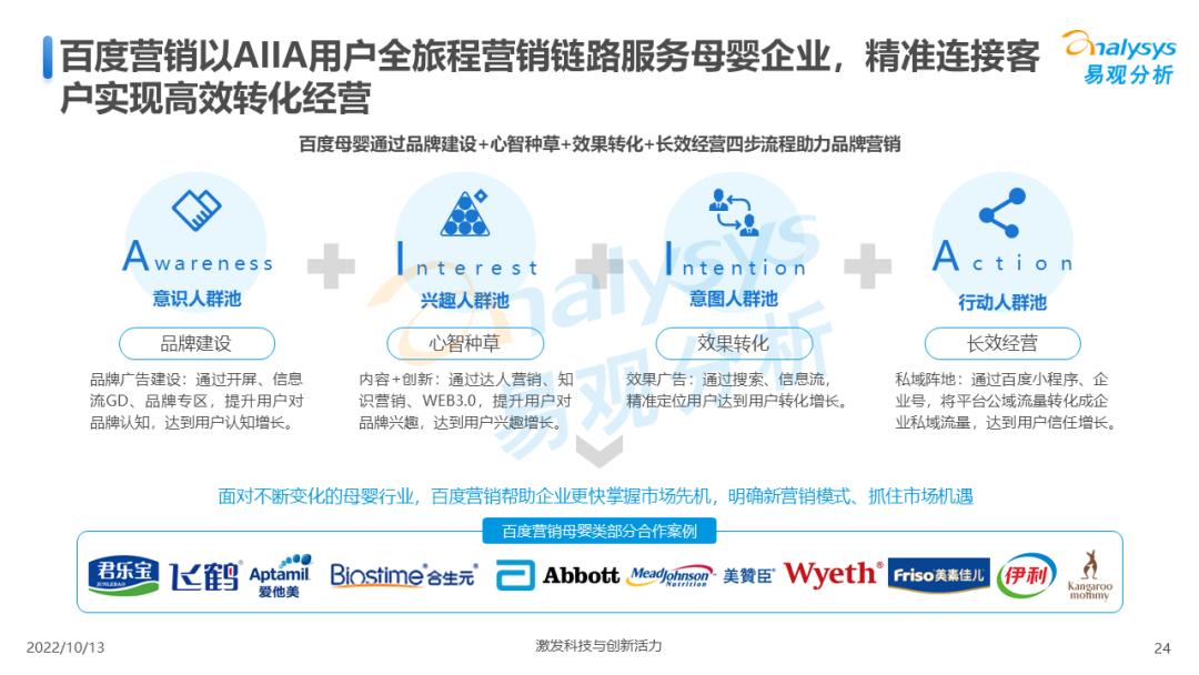 易观分析与百度营销联合发布《2022互联网母婴行业用户洞察》,对行业背景与用户行为特点进行分析,探索营销实践。百度营销依托全面的产品功能和丰富的母婴内容,精准触达母婴人群,打造用户全旅程营销链路,服务母婴企业。