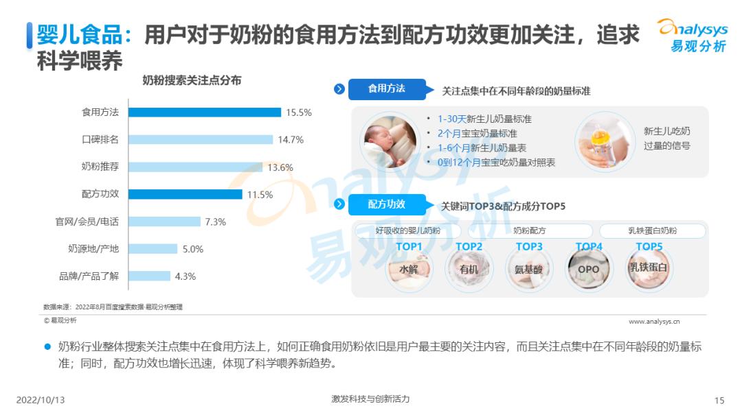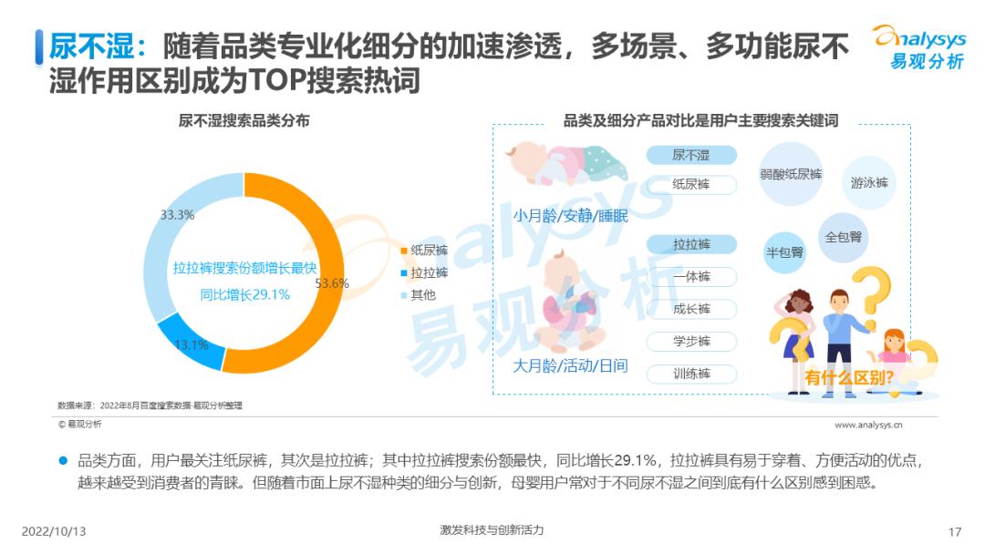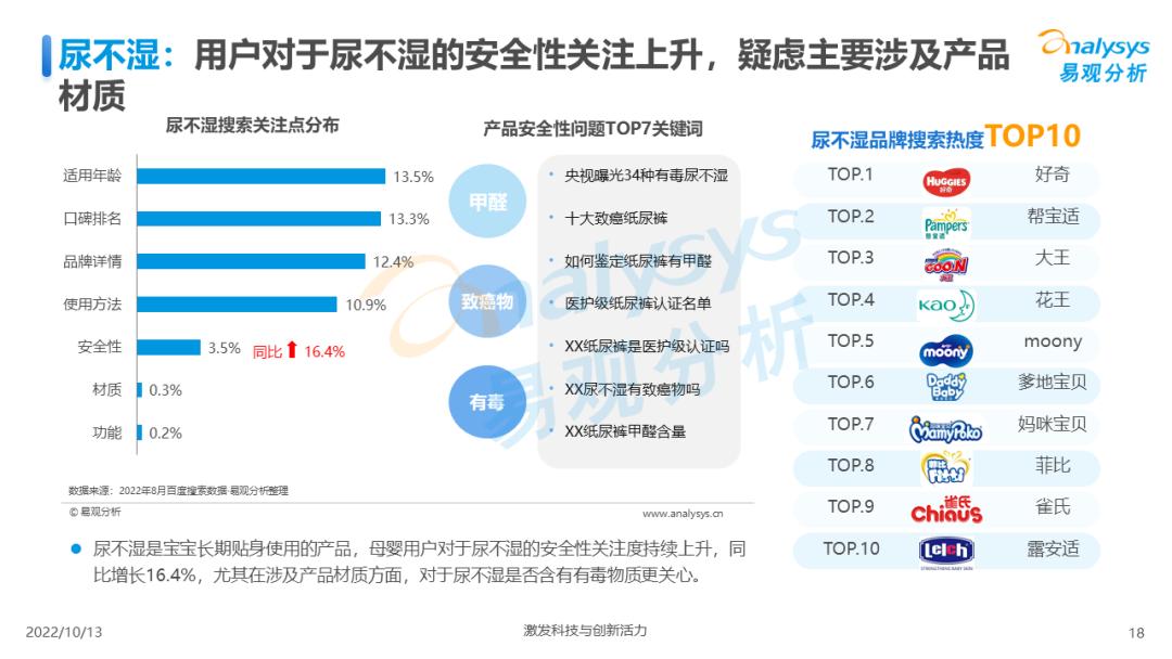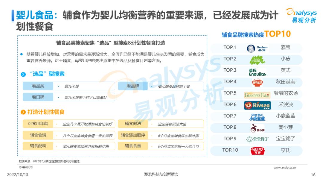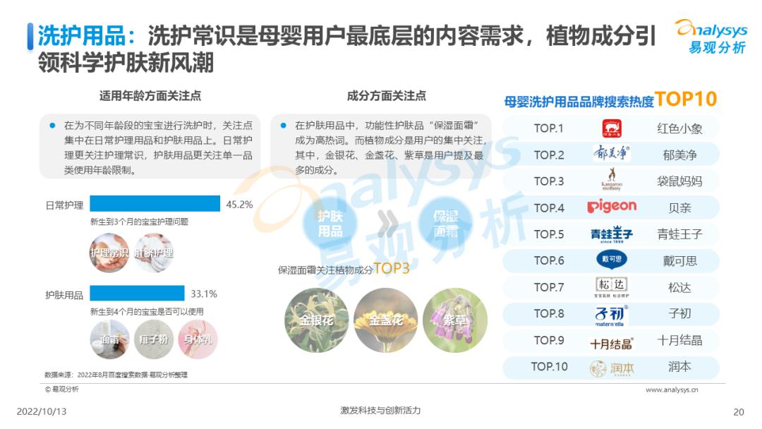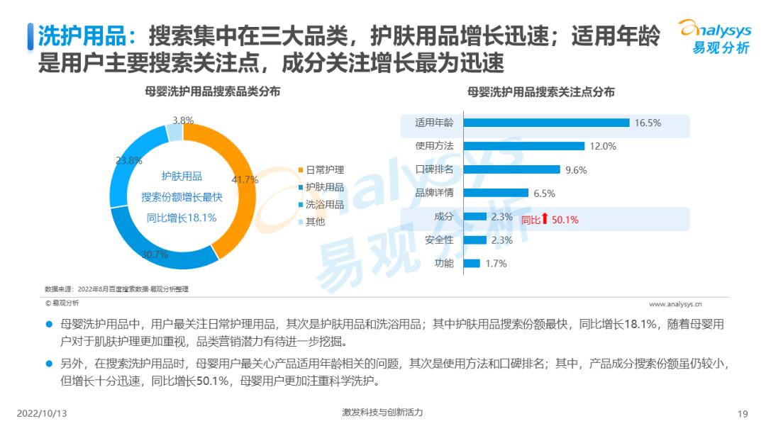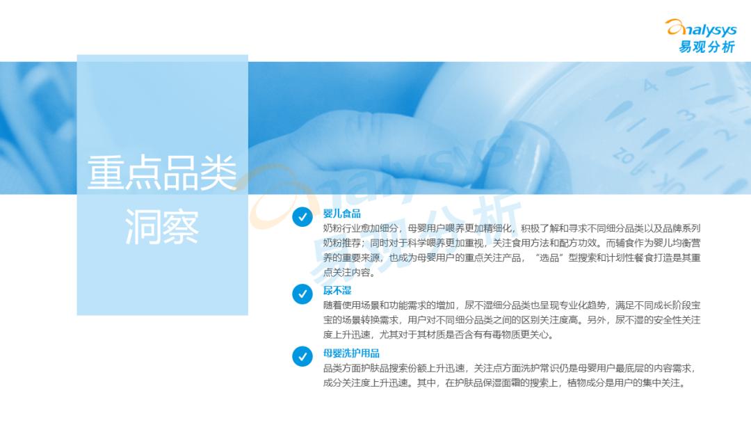 在此基础上,母婴用户形成了丰富的需求表达,并在重点品类关注上呈现出新特点:婴儿食品中,母婴用户喂养更加精细化、科学化,关注食用方法和配方功效;辅食作为婴儿均衡营养的重要来源,已经发展成为计划性餐食,成为重点关注产品。尿不湿中,随着使用场景和功能需求的增加,尿不湿细分品类更加丰富,材质安全性关注度上升迅速。母婴洗护中,品类方面护肤品搜索份额上升迅速,洗护常识仍是母婴用户最底层的内容需求,而植物成分成为科学护肤的新潮流。