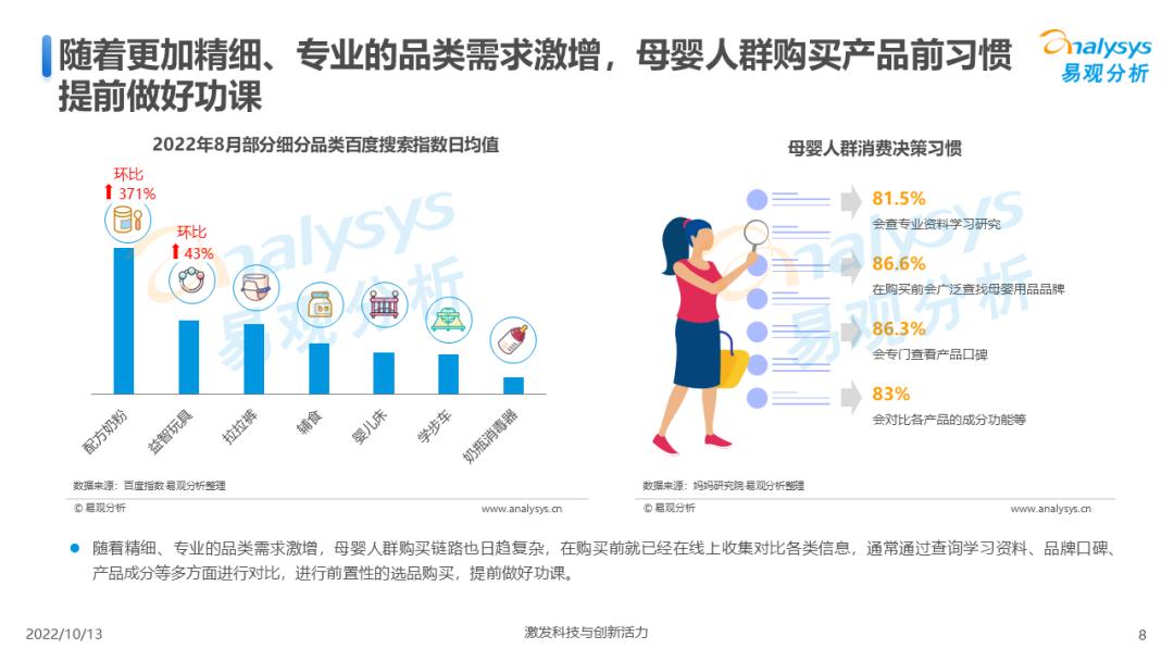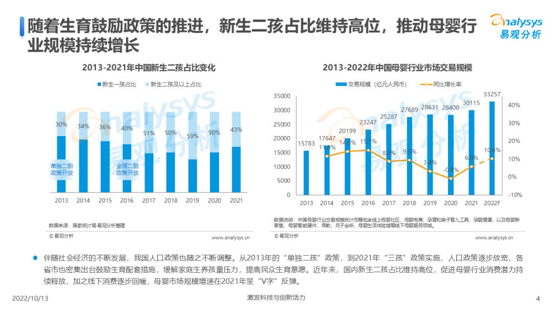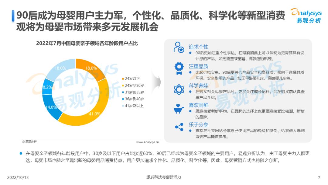 易观分析:随着生育鼓励政策的推进,新生二孩占比提升,同时推动母婴行业规模继续增长。而在下沉市场,人口红利更为明显,高频、高份额增长使得下沉市场成为母婴市场的新增量;同时,线上渠道增速保持高位,更具发展潜力。随着母婴用户代际更迭,90后带来新型消费观,推动精细、专业品类需求增加,购买习惯也发生变化,前置性做功课成为购买环节之一。