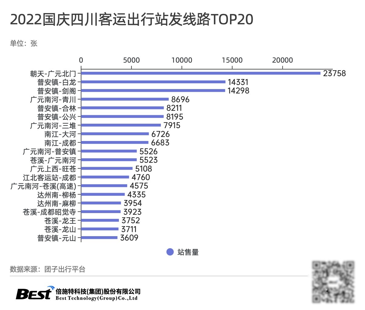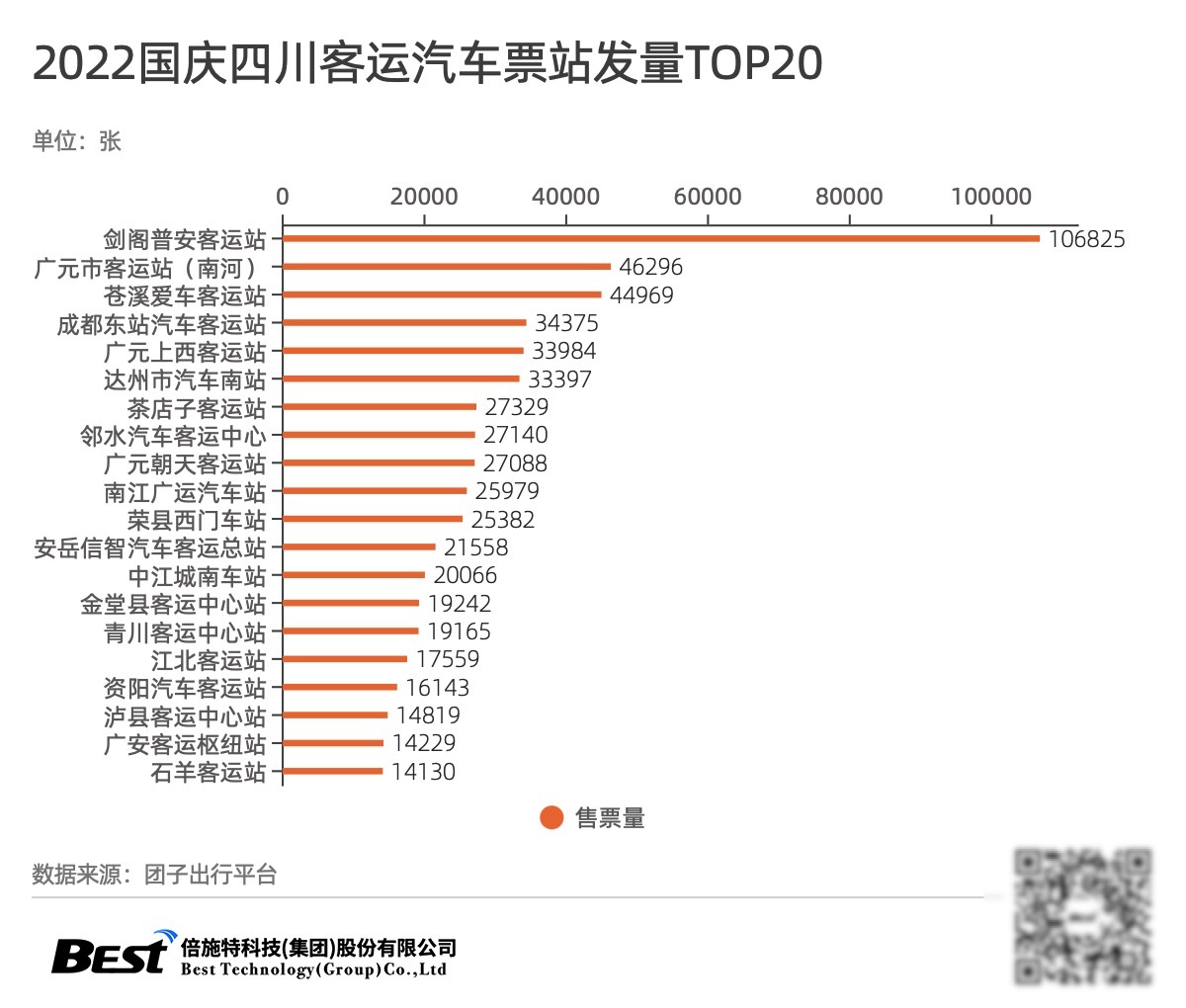 值得注意的是,由于节前部分车站执行了停班停运的防疫管控方案,成都市内出发车站及线路,极少量跻身热门车站前五名。排名最前的五个车站为剑阁普安客运站、广元市客运站(南河)、苍溪汽车客运站、成都东站汽车客运站和广元上西客运站,其中普安作为广元市下辖镇,国庆期间售出超过10万张汽车票。