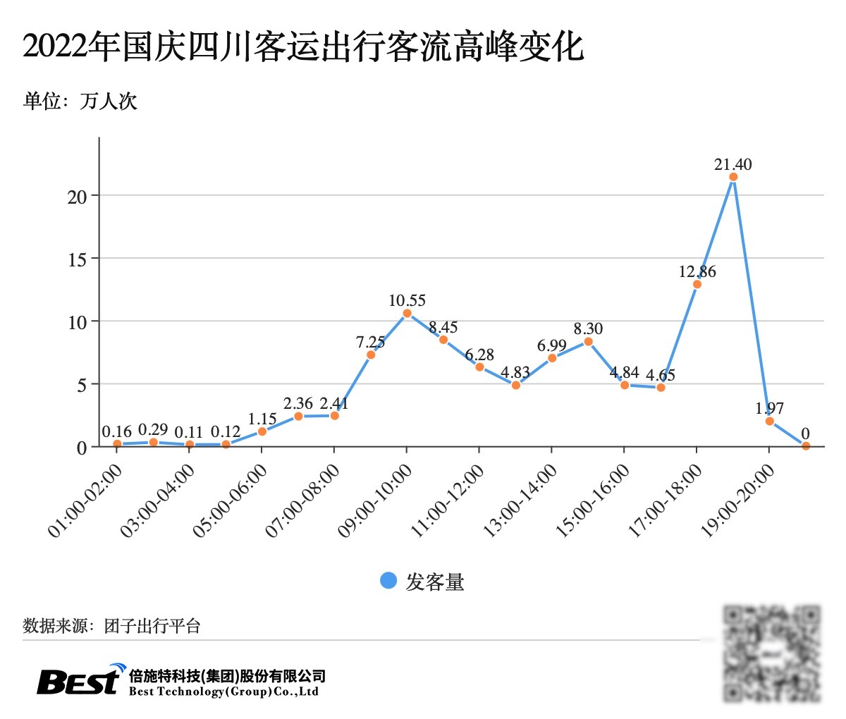 从出行时间段上看,选择傍晚出行的旅客更多,发客高峰集中在18:00-19:00,达到21.4万人次;其次是早晨09:00-10:0的出行次高峰。