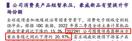 另有券商数据显示,上半年,受全球主要计算机品牌出货量同比下降影响,公司图像传感器解决方案业务同比下滑约20.97%。