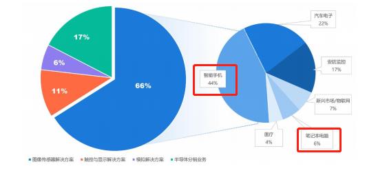 上半年,图像传感器解决方案业务实现营收72.98亿元,占当期总营收比重接近66%。进一步看,智能手机和笔记本电脑合计占图像传感器解决方案业务50%的收入比重。