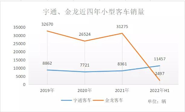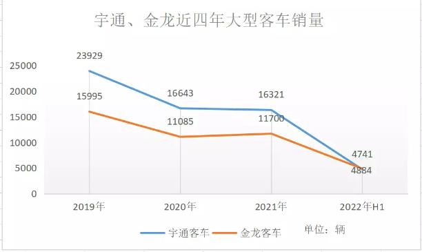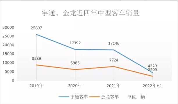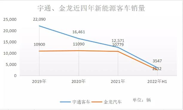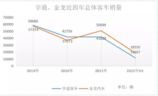 回看2019年到2021年期间宇通客车与金龙汽车的总体销量,2021年金龙汽车首次超过宇通客车,且持续到2022年上半年。