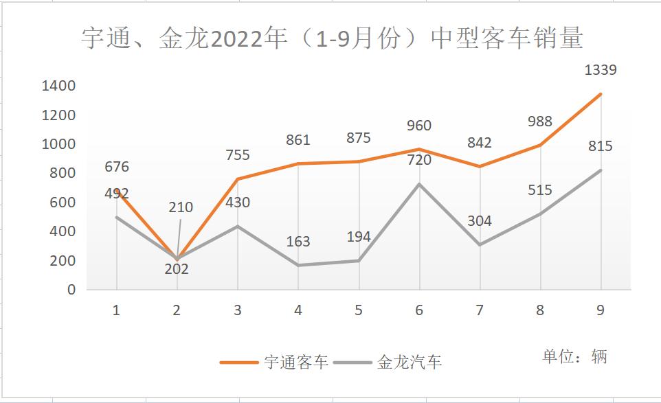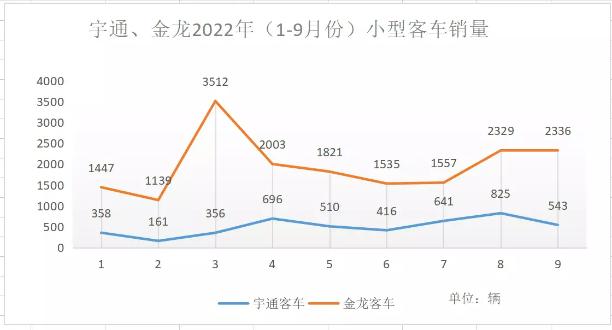 跟金龙汽车相比,宇通客车仅剩下在中型客车销量上的领先,在今年前9月份,宇通中型客车销量为7498辆,金龙汽车累计销量3843辆。