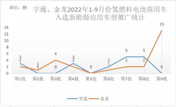 氢燃料商用车也是两大企业互相较量的赛道。据工信部官网,在2022年前9批《新能源汽车推广应用推荐车型目录》中的燃料电池商用车车型,宇通客车累计入选17辆,包括氢燃料客车、氢燃料混凝土搅拌运输车、燃料电池半挂牵引车多种车型,其中子公司郑州宇通有限公司入选7辆;金龙汽车累计入选27辆,全部为旗下子公司所生产,且主要以氢燃料电池客车为主。其中厦门金龙联合汽车工业有限公司入选14辆,金龙联合汽车工业(苏州)有限公司入选6辆,厦门金龙旅行车有限公司入选7辆。