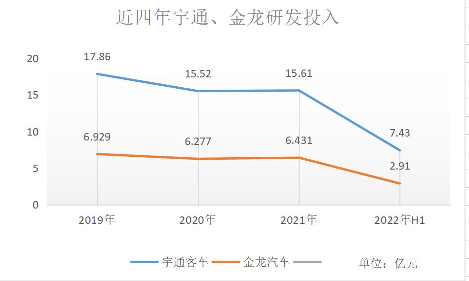 值得注意的是,虽然营收状态不尽人意,但宇通的研发投入却令人眼前一亮:7.43亿元,占营业收入比例的9.00%,是金龙汽车2倍多。