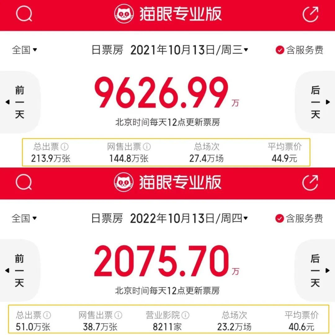 其实对比来看,去年10月13日的全国总场次为27.4万场,今年虽有疫情关闭影院的外力影响,但当日全国总场次也有23.2万场之多,下跌幅度有限。但今年10月13日总出票量仅有51万张,较去年同期下跌超过75%,而这才是导致票房同比暴跌的关键所在。