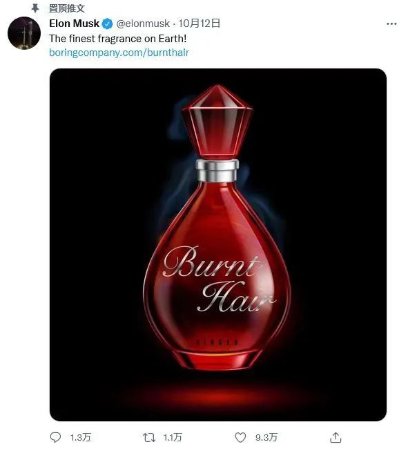 而在10月12日正式发布“BURNT HAIR”香水后,截至目前,马斯克接连发了十余条关于香水的动态,除向消费者推荐此款香水外,马斯克还发表了一连串感想,“已经迫不及待看到明天香水销售破百万美元的新闻了”,他甚至调侃道,“请买我的香水,这样我就可以买到推特了。”