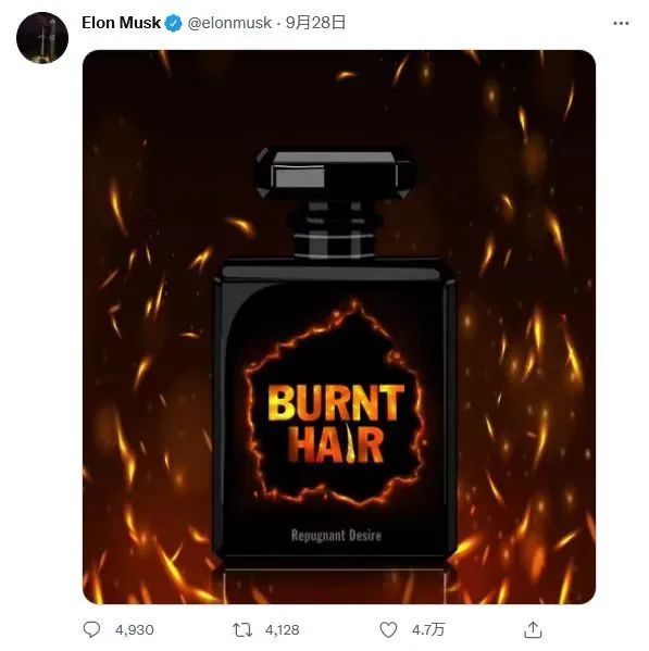 据了解,马斯克曾在9月发布一张带有“BURNT HAIR”字样的概念图,为此款香水发布预热。 10月9日,马斯克发布产品图,再次预告“(香水)即将到来”。