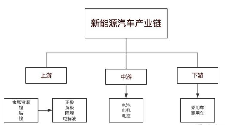 新能源汽车产业链一共分为三个环节,分别是上游原材料,中游“三电”系统和下游整车制造。