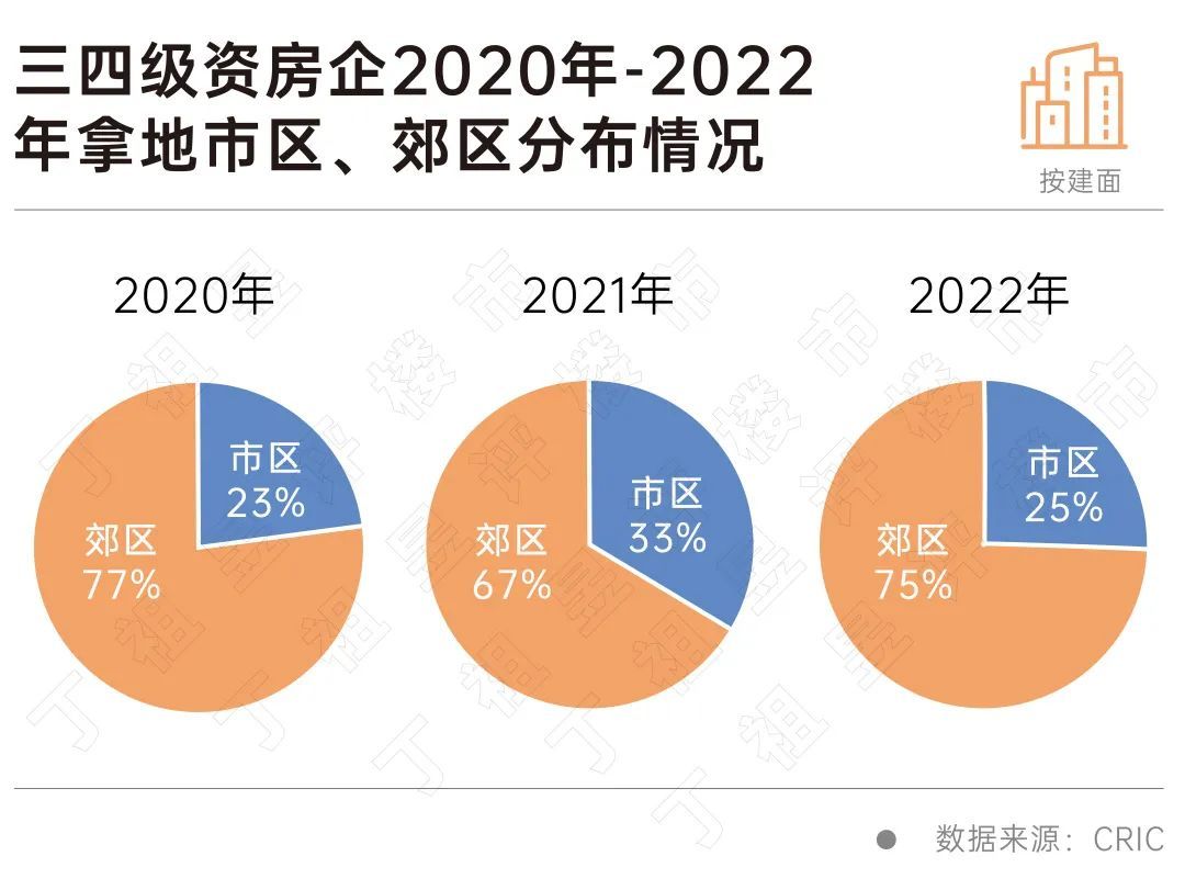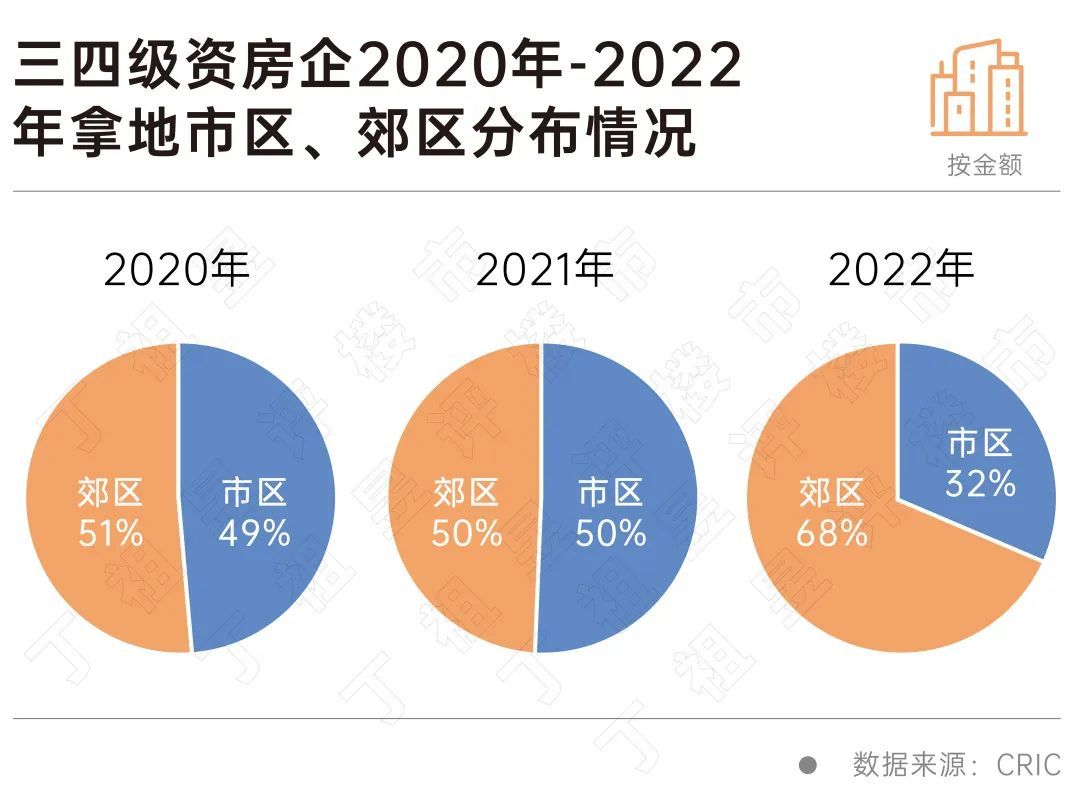 从拿地金额的角度,对比不同年份三四级资质房企的拿地分布情况来看,市区拿地占比在2022年发生明显改变。