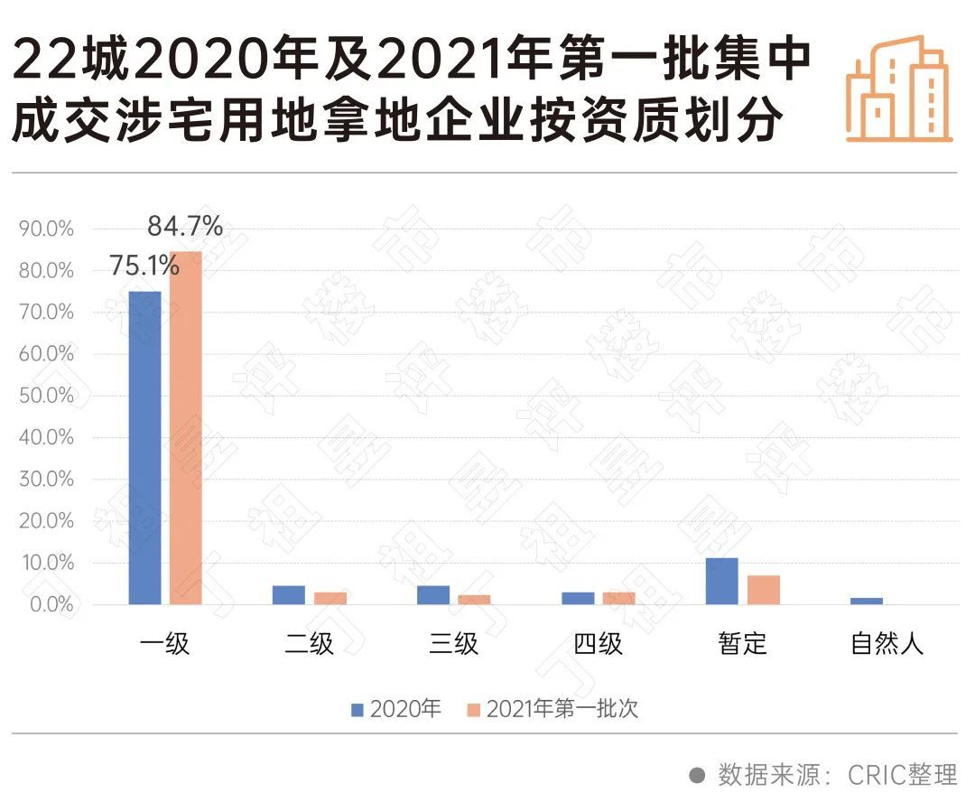 结合2020年和2021年第一批次22城涉宅用地成交情况来看,在市场热度不断走高、重点城市土地竞争压力增加的影响下,资金实力更强的高资质房企成为2021年第一批集中供地的拿地主力军,占比达84.7%,较2020年上涨了近10个百分点。而开发资质较低的房企拿地占比明显回落,条件仅满足三级及以下资质的企业拿地占比仅有12.4%。