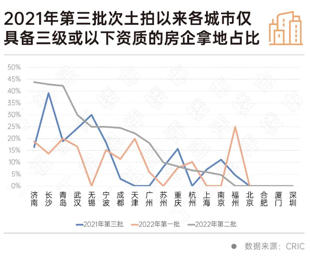 就22城整体来看,条件在四级及以下的低开发资质房企的拿地占比在2022年第一批、第二批是逐步上升,尤其是2022年第二批次,比例高达11.8%,创下集中供地以来的新高。