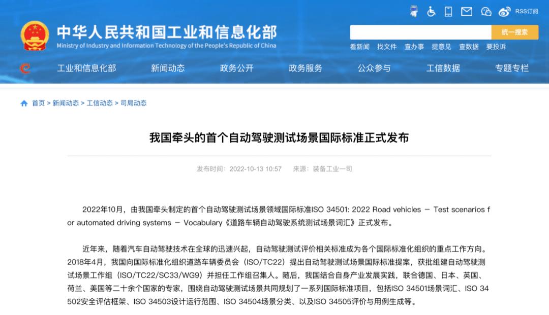 近日,工信部发布消息称,由我国牵头制定的首个自动驾驶测试场景领域国际标准ISO 34501: 2022 Road vehicles - Test scenarios for automated driving systems - Vocabulary《道路车辆自动驾驶系统测试标准场景词汇》(以下简称《标准》)已于10月正式发布。