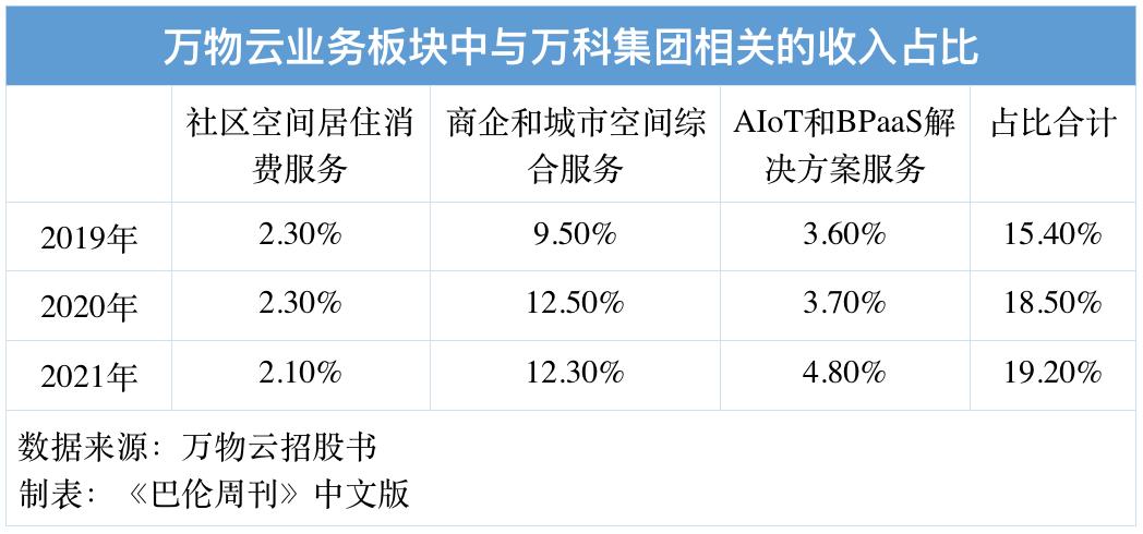 《巴伦周刊》中文版认为,即使万物云已成功分拆上市,其业务的基本盘离不开万科。以社区空间居住消费服务业务为例,其下分“住宅物业服务”、“居住相关资产服务”和“其他社区增值服务”三个业务条线。在“住宅物业服务”中,从2019年至2021年,来自万科相关的收入占比分别为66.5%、64.5%、61.0%。