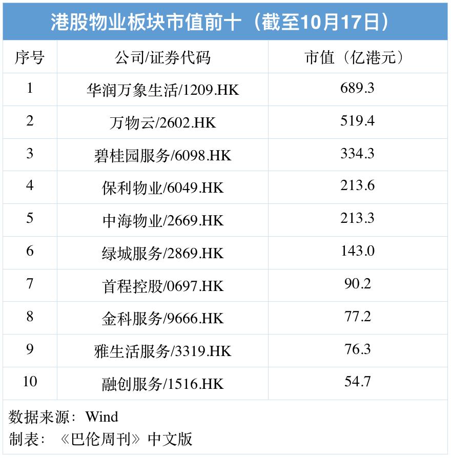 万物云的上市,改变了港股物业板块的市值排名。截至10月17日收盘,万物云519亿港元的市值在港股物业服务提供商中位居第二。