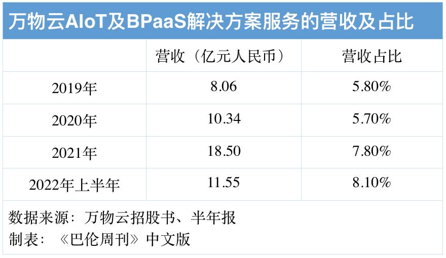 在万物云的三大业务中,AIoT和BPaaS解决方案业务的收入占比最小,2019年至2021年分别为5.8%、5.7%和7.8%,在2022年上半年进一步提升至8.1%。善意的解读是,万物云的科技成色正在逐渐形成。