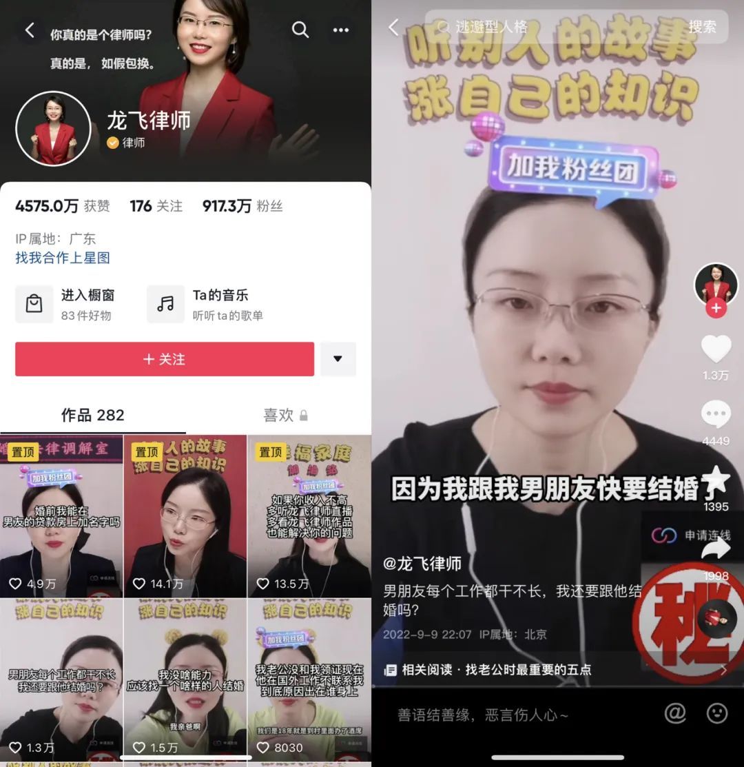 抖音平台上,婚恋专家“龙飞律师”已有900多万粉丝,单挑视频的点赞平均过万,直播场均在线人数达3万。
