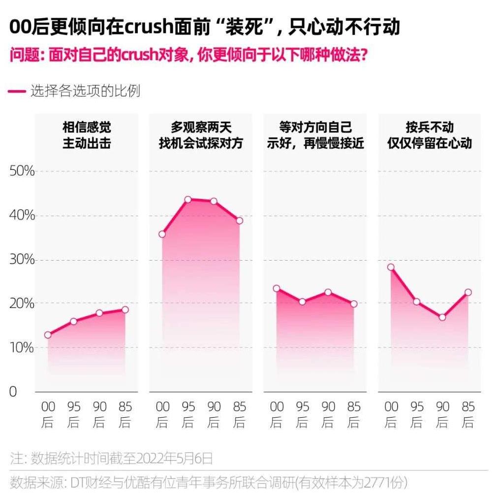 甚至有调查显示,Z世代患上了“爱情恐惧症”,在前任面前“蹦迪”,在crush面前“装死”。