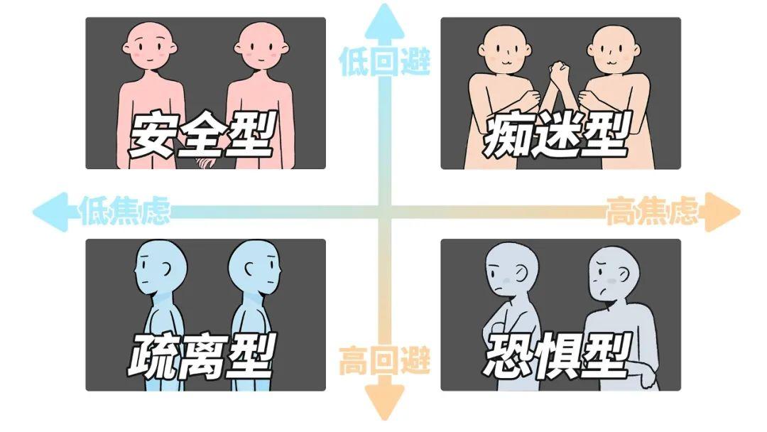 心理学上根据回避和焦虑的高低将亲密关系划分为四大依恋类型:安全型、疏离型、痴迷型和恐惧型。
