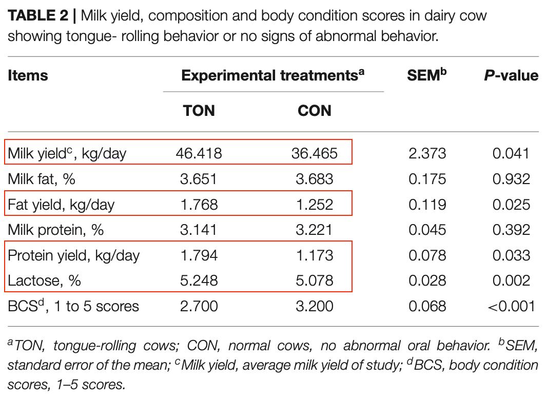 经常进行卷舌的牛的牛奶产量、牛奶中的脂肪、蛋白质和乳糖含量的日产量明显高于无卷舌行为的牛|参考资料[2]
