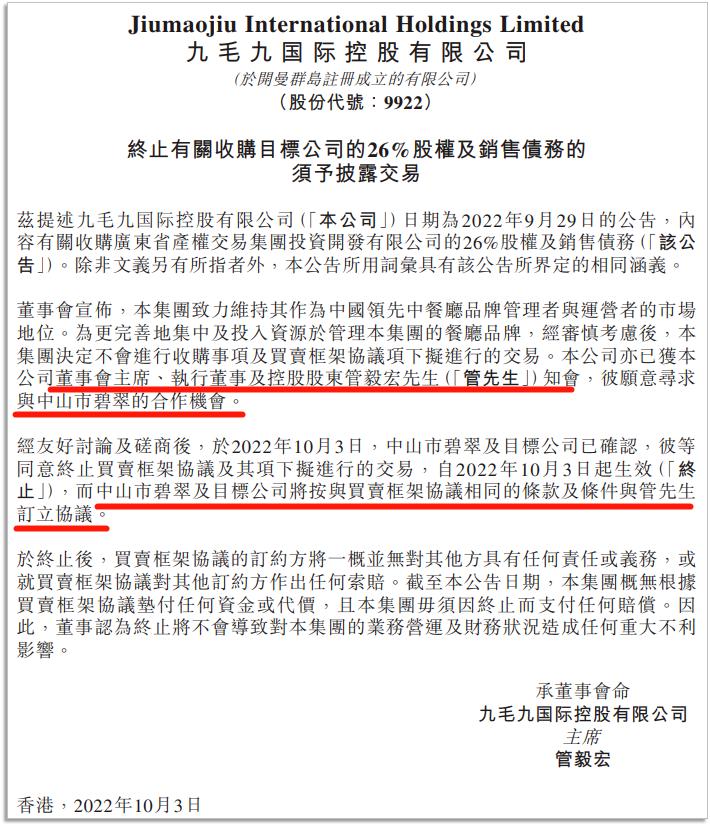 奈何投资者并不买账。四天之后,九毛九只得再次发布公告,宣布中止交易。公告称,这桩买卖公司不做了,由老板管毅宏接盘。公告当天,公司股价大幅回血,又涨回了12.27%。